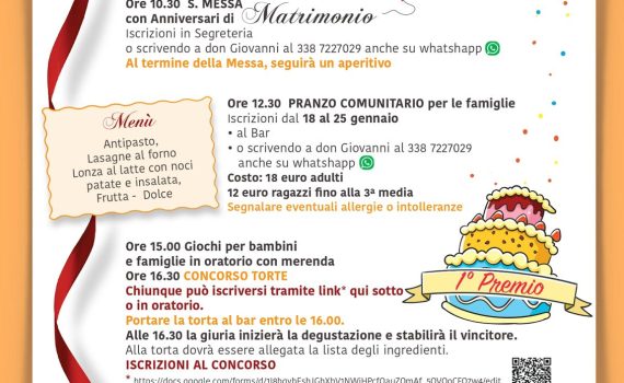 Domenica 28 gennaio è prevista la festa patronale della Parrocchia Sacra Famiglia. Riportiamo il programma in dettaglio e il collegamento per iscriversi al CONCORSO TORTE.