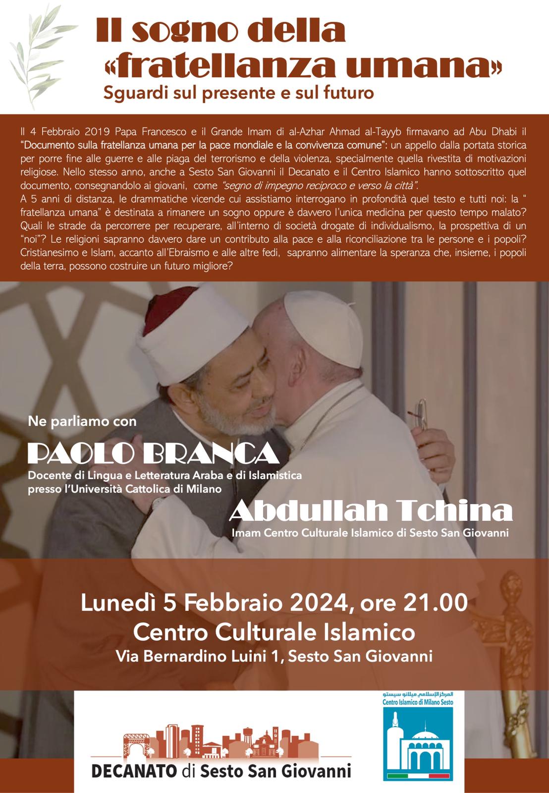 Lunedì 5 febbraio 2024 alle 21.00 presso il Centro Culturale Islamico, in via Luini 1 a Sesto San Giovanni, si rinnova questo impegno ancora di più, per essere uniti e compatti per i diritti dell’uomo e per i diritti delle comunità con una serata promossa dal Decanato di Sesto San Giovanni e dal Centro Islamico di Milano Sesto insieme a Paolo Branca, docente di lingua e letteratura araba e di islamistica dell’Università Cattolica di Milano, e Abdullah Tchina, Imam del Centro Culturale Islamico di Sesto San Giovanni.