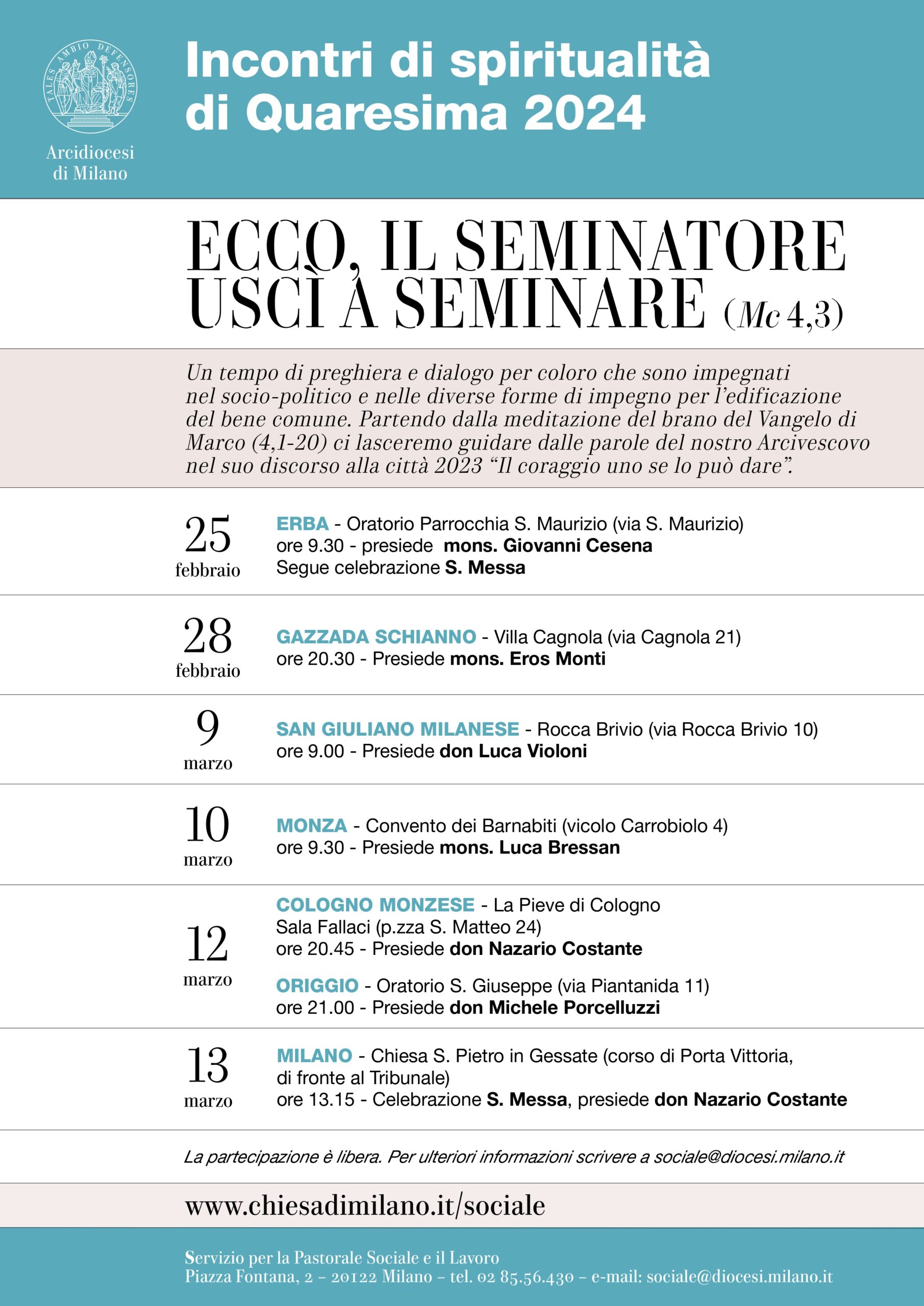 Martedì 12 marzo alle 20.45 presso La Pieve di Cologno – Sala Fallaci (Piazza S. Matteo, 24 – Cologno Monzese) don Nazario Costante, Responsabile del Servizio per la Pastorale sociale e il lavoro della Diocesi di Milano, propone una riflessione: “Ecco, il Seminatore uscì a seminare”. Partendo dalla lettura del brano del Vangelo di Marco (4,1-20), si affronteranno le parole dell’Arcivescovo Mario Delpini nel suo discorso alla città 2023 “Il coraggio uno se lo può dare”.