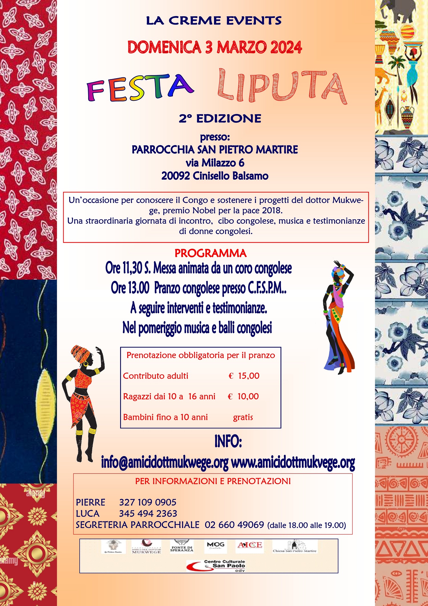 Da due anni la comunità congolese commemora a Cinisello Balsamo nel mese di marzo (dedicato alla donna) la giornata LIPUTA in memoria di tutte le donne congolesi che hanno subito violenza e che continuano a subirne a causa della guerra imposta a questo popolo. LIPUTA è proprio il tessuto del vestito delle donne congolesi segno di tradizione, dignità e protezione amorevole. Quando nasce un bambino, infatti, è avvolto nel LIPUTA della mamma.