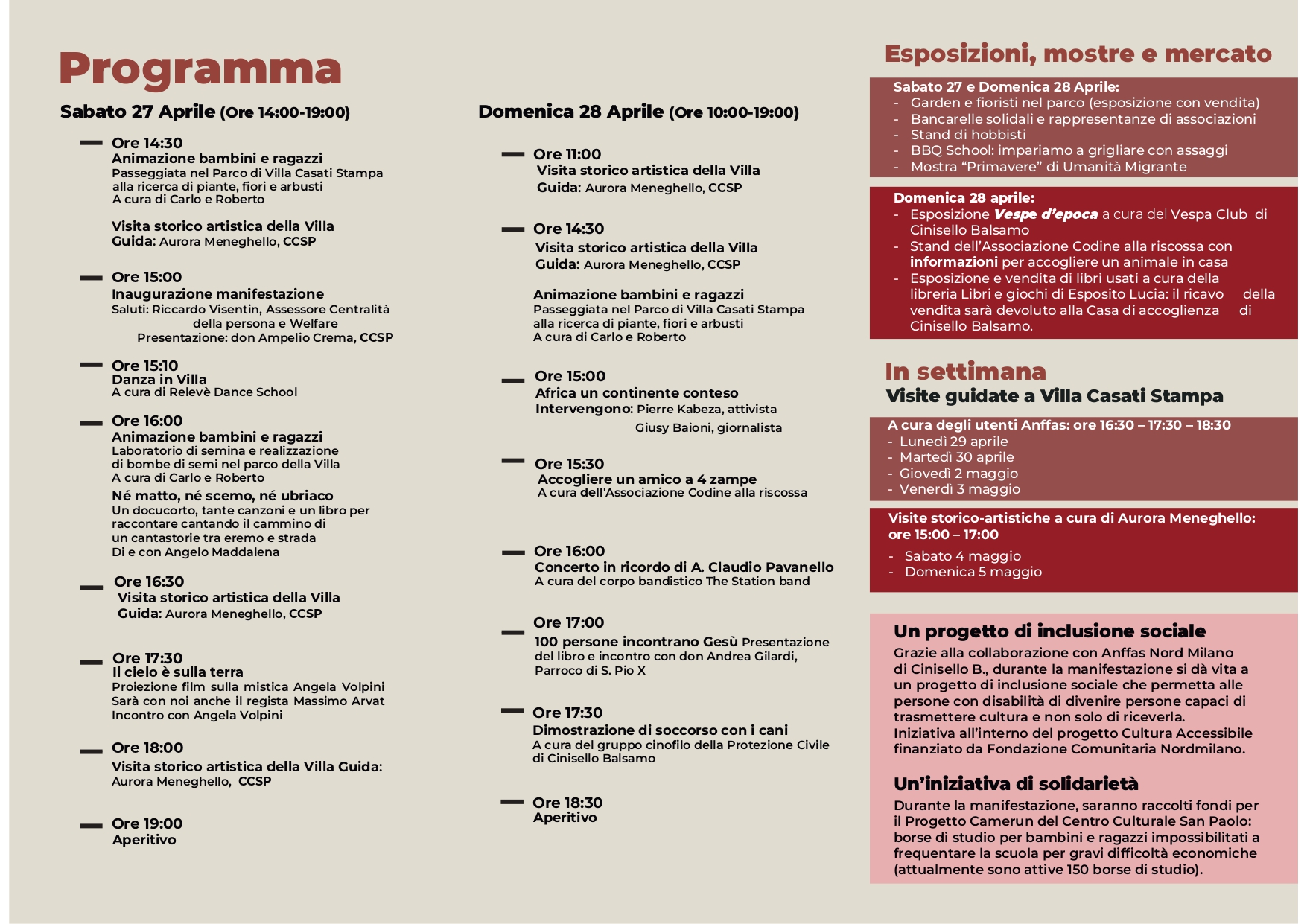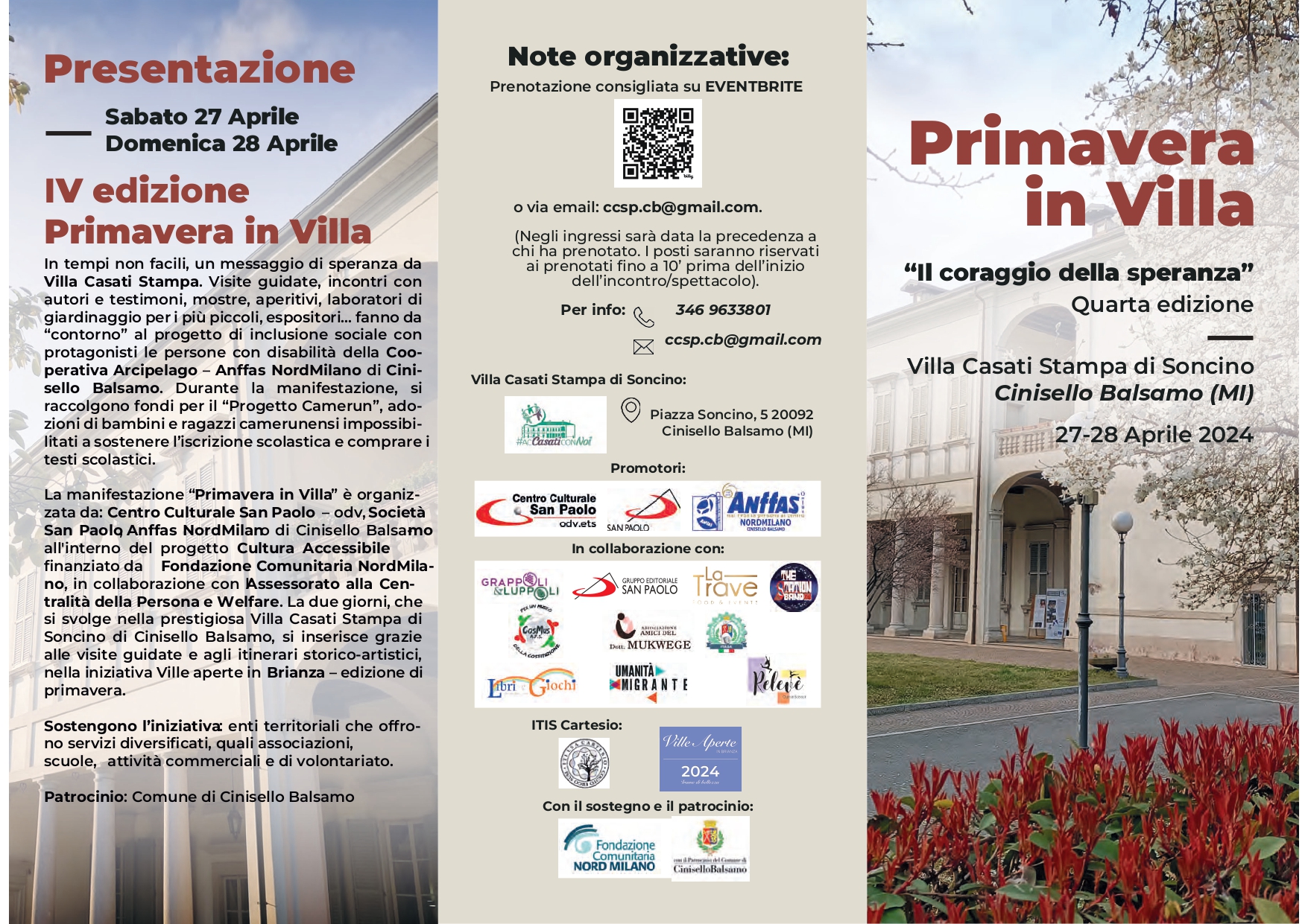 La manifestazione “Primavera in Villa” è organizzata da: Centro Culturale San Paolo – odv, Società San Paolo, Anffas NordMilano di Cinisello Balsamo all’interno del progetto Cultura Accessibile finanziato da Fondazione Comunitaria NordMilano, in collaborazione con l’ Assessorato alla Centralità della Persona e Welfare. La due giorni, che si svolge nella prestigiosa Villa Casati Stampa di Soncino di Cinisello Balsamo, si inserisce grazie alle visite guidate e agli itinerari storico-artistici, nella iniziativa Ville aperte in Brianza – edizione di primavera.