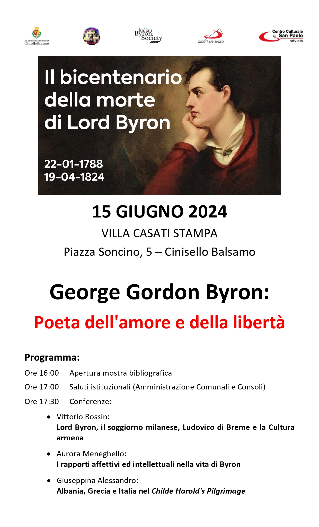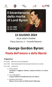 Per commemorare il bicentenario della morte di Lord Byron (22-01-1788/19-04-1824), l’associazione “Amici di villa di Breme”, con il Comune di Cinisello Balsamo e il Centro Culturale San Paolo, organizza una mostra/conferenza in cui si approfondirà la figura di questo grande poeta.