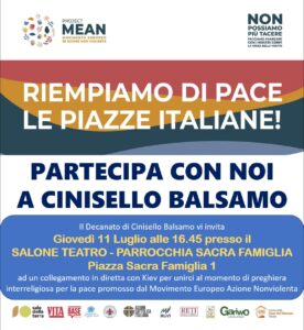 Decanato di Cinisello Balsamo vi invita Giovedi 11 Luglio alle 16.45 presso il SALONE TEATRO – PARROCCHIA SACRA FAMIGLIA, Piazza Sacra Famiglia 1 ad un collegamento in diretta con Kiev per unirci al momento di preghiera interreligiosa per la pace promosso dal Movimento Europeo Azione Nonviolenta.