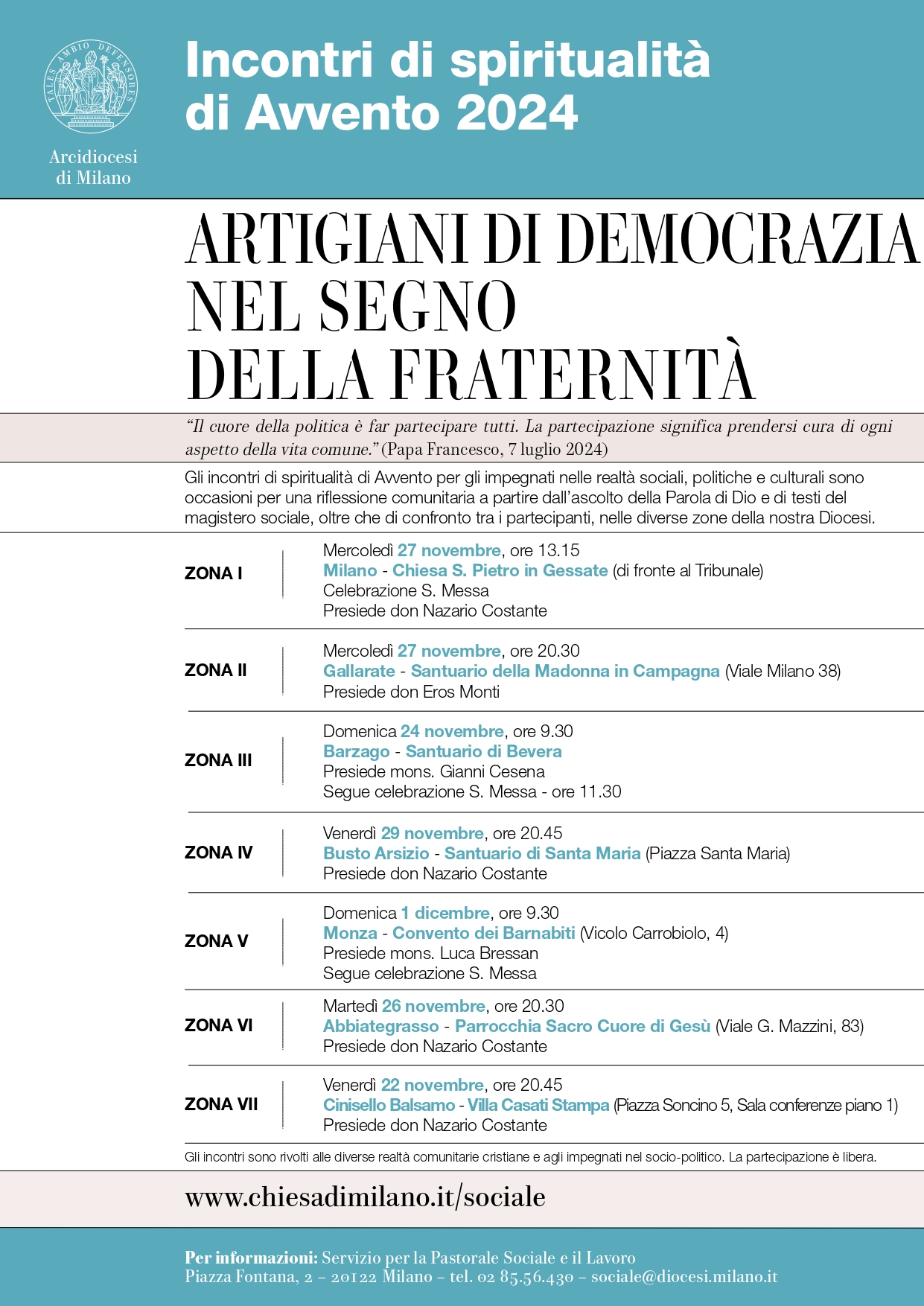 Gli incontri di spiritualità di Avvento per gli impegnati nelle realtà sociali, politiche e culturali sono occasioni per una riflessione comunitaria a partire dall’ascolto della Parola di Dio e di testi del magistero sociale, oltre che di confronto tra i partecipanti, nelle diverse zone della nostra Diocesi.