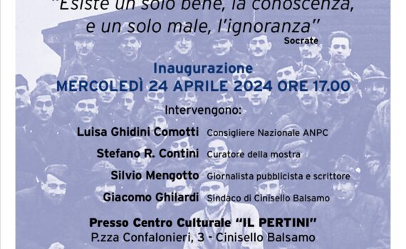 Mostra fotografica: “RESISTERE, NON PIEGARCI”, LA RESISTENZA SENZ’ARMI DEI MILITARI ITALIANI NEI LAGER NAZISTI (1943 – 1945). Inaugurazione: MERCOLEDÌ 24 APRILE 2024 ORE 17.00 Presso Centro Culturale “IL PERTINI”; P.zza Confalonieri, 3 – Cinisello Balsamo Intervengono: Luisa Ghidini Comotti – Consigliere Nazionale ANPC Stefano R. Contini – Curatore della mostra […]