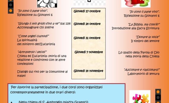 PANE E PAROLA: Corsi di formazione Per i ministri straordinari dell’Eucaristia e per i lettori Per i ministri straordinari: Giovedi 17 0ttobre: “Io sono il pane vivo”; Riflessione su Giovanni 6. Giovedi 24 ottobre: “Giunga il mio grido fino a te”(Sal 119) Accompagnare chi soffre. Giovedì 31 ottobre: “Come angeli […]