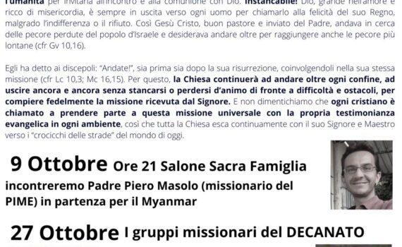 Dalla lettera di PAPA FRANCESCO in occasione della Giornata Missionaria Mondiale: “ho tratto il tema dalla parabola evangelica del banchetto nuziale (cfr Mt 22,1-14) all’inizio del comando del re ai suoi servi, ci sono i due verbi che esprimono il nucleo della missione: “andate”‘ e “chiamate”‘ nel senso di “invitate”. […]