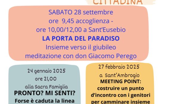 Il decanato di Cinisello Balsamo propone tre incontri di formazione catechisti: SABATO 28 settembre ore 9,45 accoglienza – ore 10,00/12,00 a Sant’Eusebio : LA PORTA DEL PARADISO, Insieme verso il giubileo meditazione con don Giacomo Perego. 24 gennaio 2025 ore 21,00 alla Sacra Famiglia , PRONTO? MI SENTI? Forse è […]
