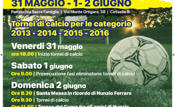 La parrocchia sacra Famiglia organizza: 13° Memorial Nunzio Ferraro – torneo di calcio categorie 2013-2014-2015-2015. Venerdì 31 maggio: Ore 18:00 inizio dei tornei di calcio Sabato 1 giugno: Ore 9:00 prosecuzione fasi eliminatorie tornei di calcio Domenica 2 Giugno: Ore 8:30 Santa Messa in ricordo di Nunzio Ferraro, Ore 9:30 […]