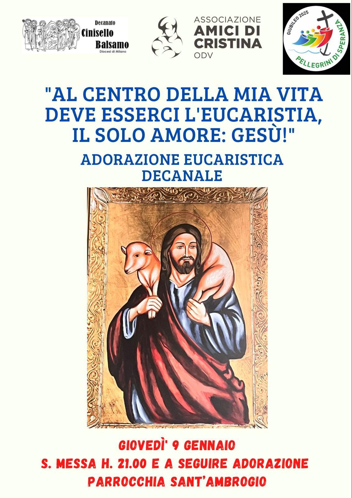 Deca-News Adorazione Eucaristica Decanale – 9/01/2025 Pubblicato 06/01/2025 Condividi questo contenuto“Al centro della mia vita deve esserci l’Eucarestia, il solo amore : Gesù!” Adorazione eucaristica decanale che si terrà giovedì 9 gennaio presso Parrocchia Sant’Ambrogio: Ore 21 Santa Messa A seguire adorazione eucaristica Post Views: 302