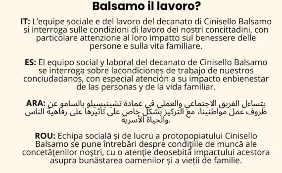 L’Equipe Sociale e del Lavoro del Decanato di Cinisello Balsamo sta conducendo un importante sondaggio sulle condizioni di lavoro dei nostri concittadini, con particolare attenzione al loro impatto sul benessere delle persone e sulla vita familiare. Questo sondaggio ha l’obiettivo di raccogliere dati preziosi che ci permetteranno di comprendere meglio […]