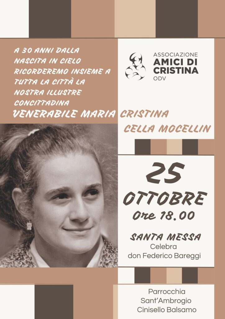 Deca-News SANTA MESSA IN OCCASIONE DEI 30 ANNI DALLA NASCITA IN CIELO DELLA NOSTRA VENERABILE CONCITTADINA MARIA CRISTINA CELLA – 25/10/2025 Pubblicato 17/10/2025 Condividi questo contenuto Post Views: 224