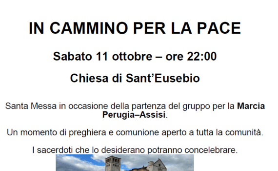 Sabato 11 ottobre, alle ore 22:00, presso la chiesa di Sant’Eusebio, sarà celebrata una Santa Messa in occasione della partenza del gruppo di persone che parteciperà alla Marcia per la Pace Perugia–Assisi.La celebrazione è aperta a tutti: anche chi non parteciperà alla marcia e anche ai sacerdoti che lo desiderano […]
