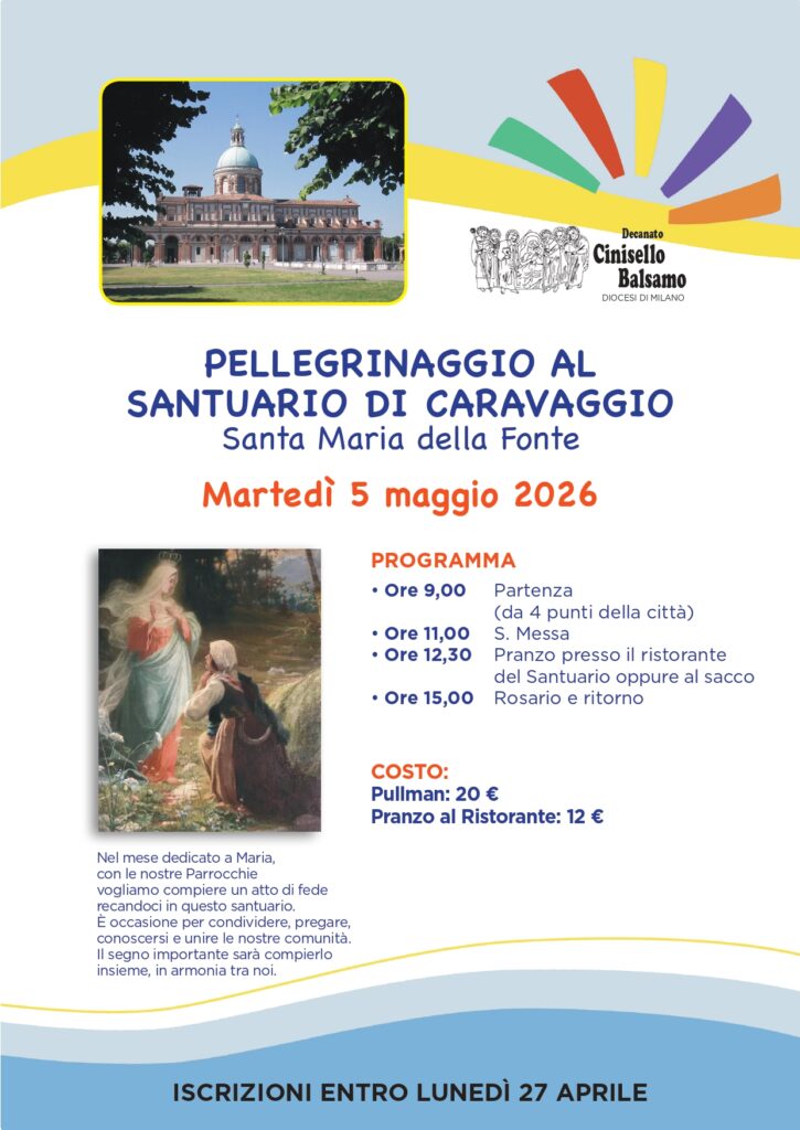 Deca-News PELLEGRINAGGIO AL SANTUARIO DI CARAVAGGIO – 05-05/2026 Pubblicato 17/04/2026 Condividi questo contenuto Post Views: 38