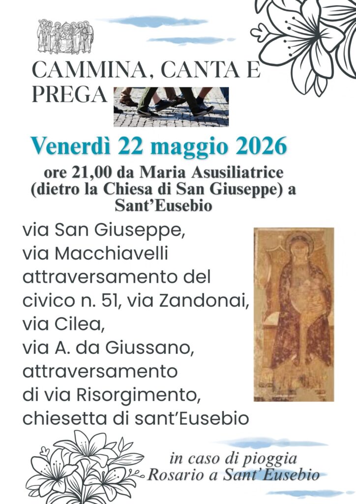 Deca-News CAMMINA, CANTA E PREGA – 22/05/2026 Pubblicato 24/04/2026 Condividi questo contenuto Post Views: 16